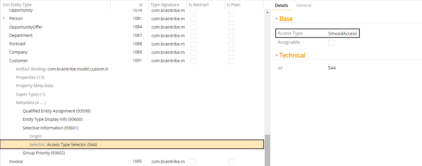 In this example, a Selective Information metadata was assigned to an entity called Customer, and an access type selector was assigned to the metadata. The Access Type property was assigned the SmoodAccess type while the Assignable property is left unchecked.